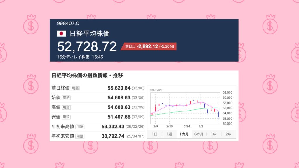 昨日の株式市場では、日経平均株価が大きく下落しました。最終的には前日比2,892円安となり、さらに日中には一時4,000円近く下げる場面もありました。ニュースを見て驚いた方や、不安に感じた方も多かったのではないでしょうか。